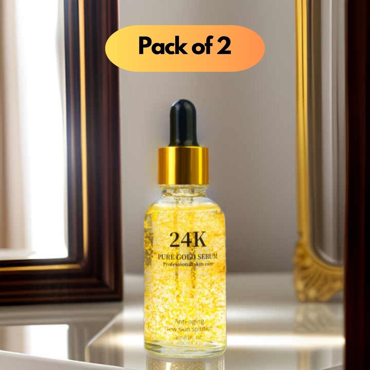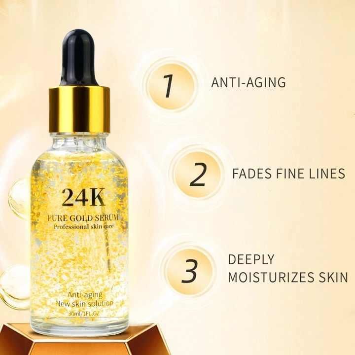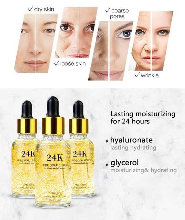 Product Description - Product Name: 24k Luxury gold serum pack of 2 (30 ml) Package Contains: It has 2 Piece of Face Serum 30ml Composition: Olive Oil, Octanoic, Silicon Dioxide, Vitamin E Acetate, Gold Foil. Product Quantity: 30ml Skin Type: All Skin Type Form: Serum Combo: Pack of 1 Ideal for: Women Usage/ Benefits: Olive Oil, Octanoic, Silicon Dioxide, Vitamin E Acetate, Gold Foil. Whitening, Brightening Weight: 150