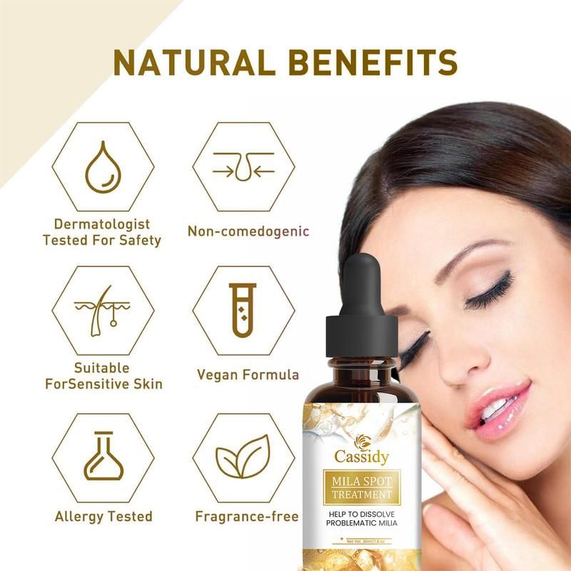 CASSIDY Mila Spot Treatment, a 30ml powerhouse designed to tackle problematic milia with precision and care. This targeted treatment works effectively to dissolve stubborn milia, those tiny, white cysts that often appear around the eyes and cheeks.