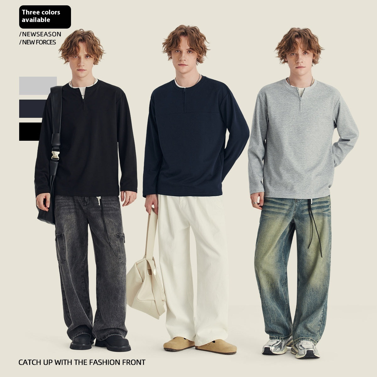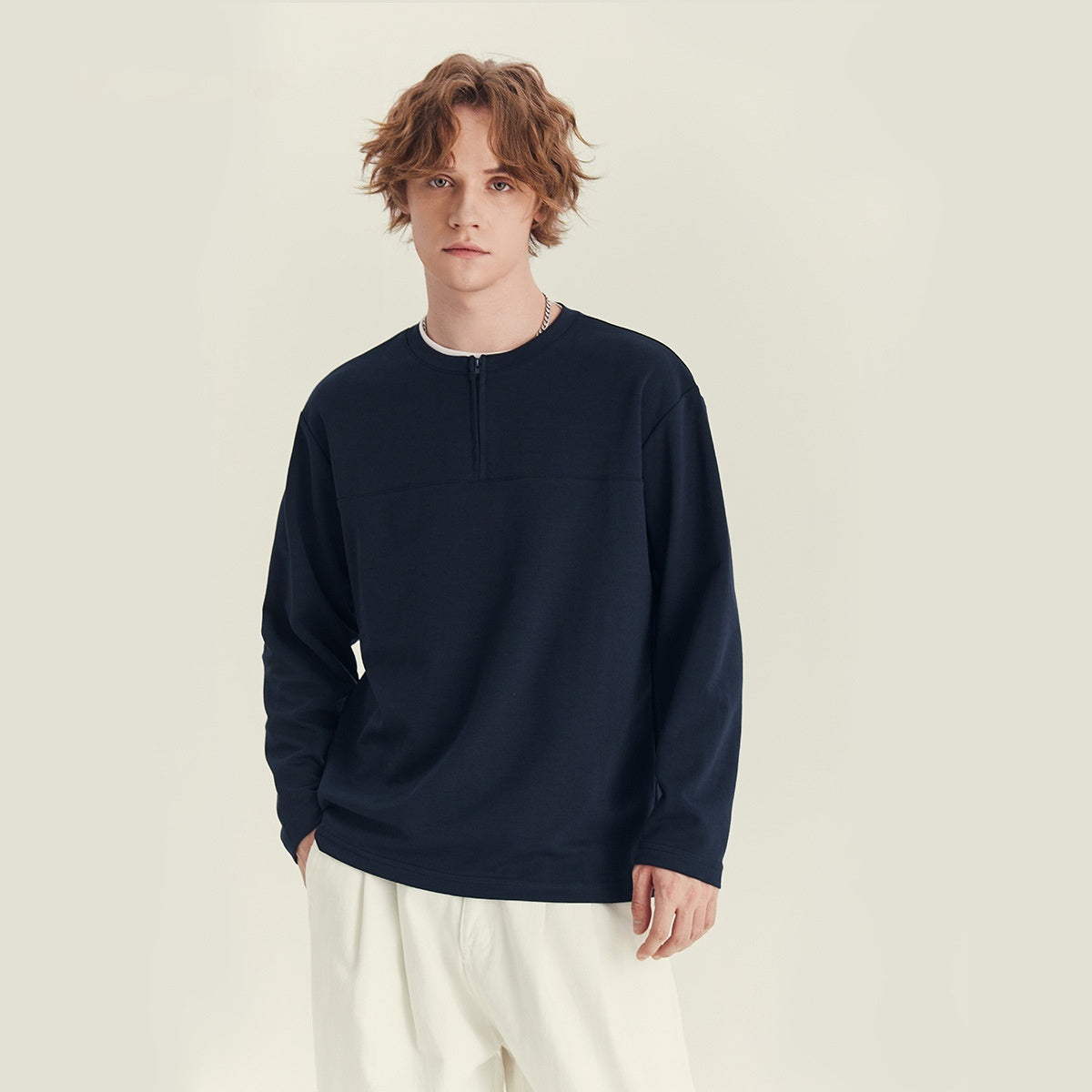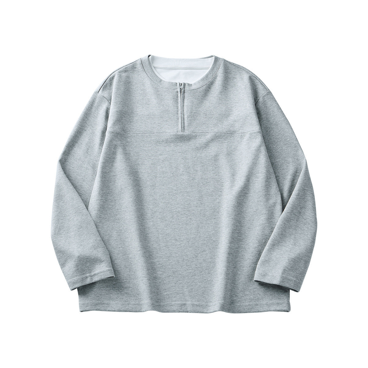 Half Long-sleeve Zipper T-shirt Men's Autumn High-grade Contrast Color Loose Crew Neck Top