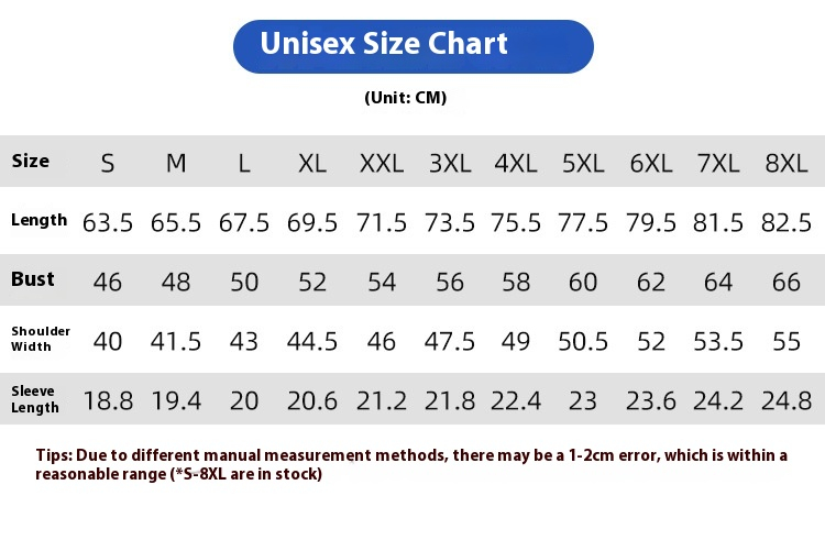 Size: S,M,L,XL,2XL,3XL,4XL,5XL,6XL,7XL,8XL