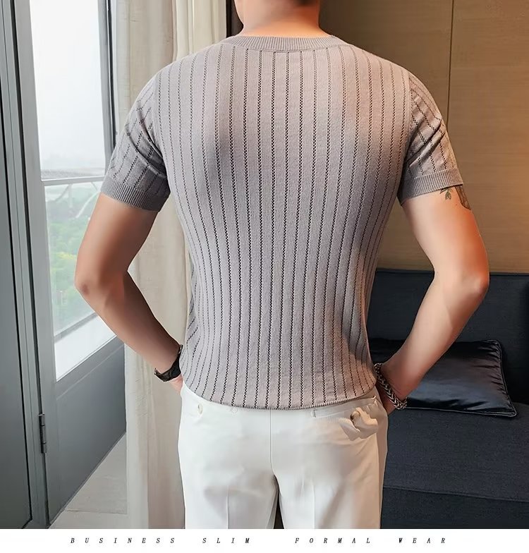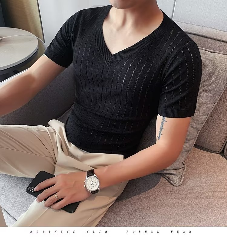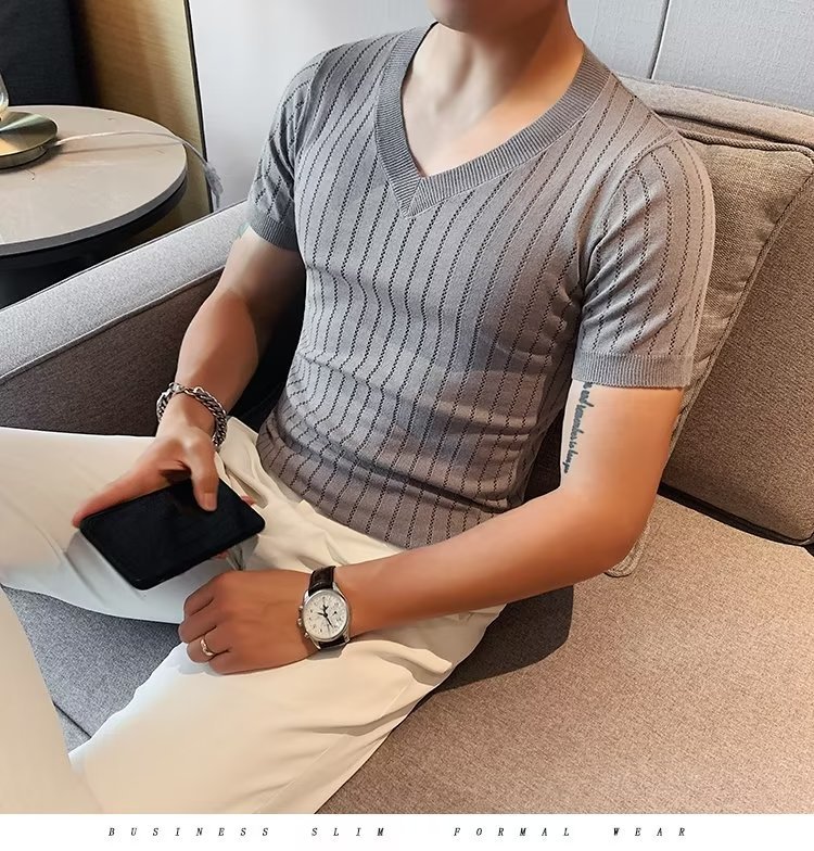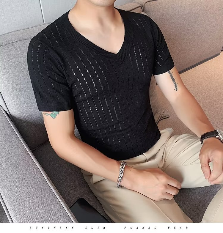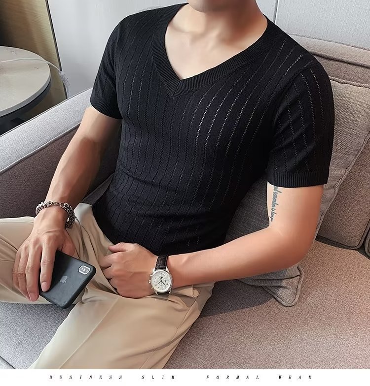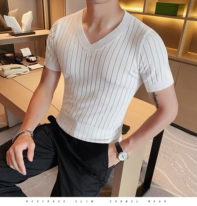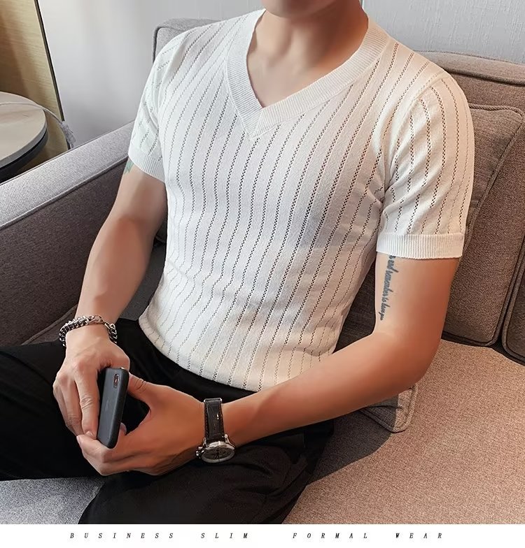 Men's Half Sleeve Hollow V-neck Slim-fit Short-sleeved