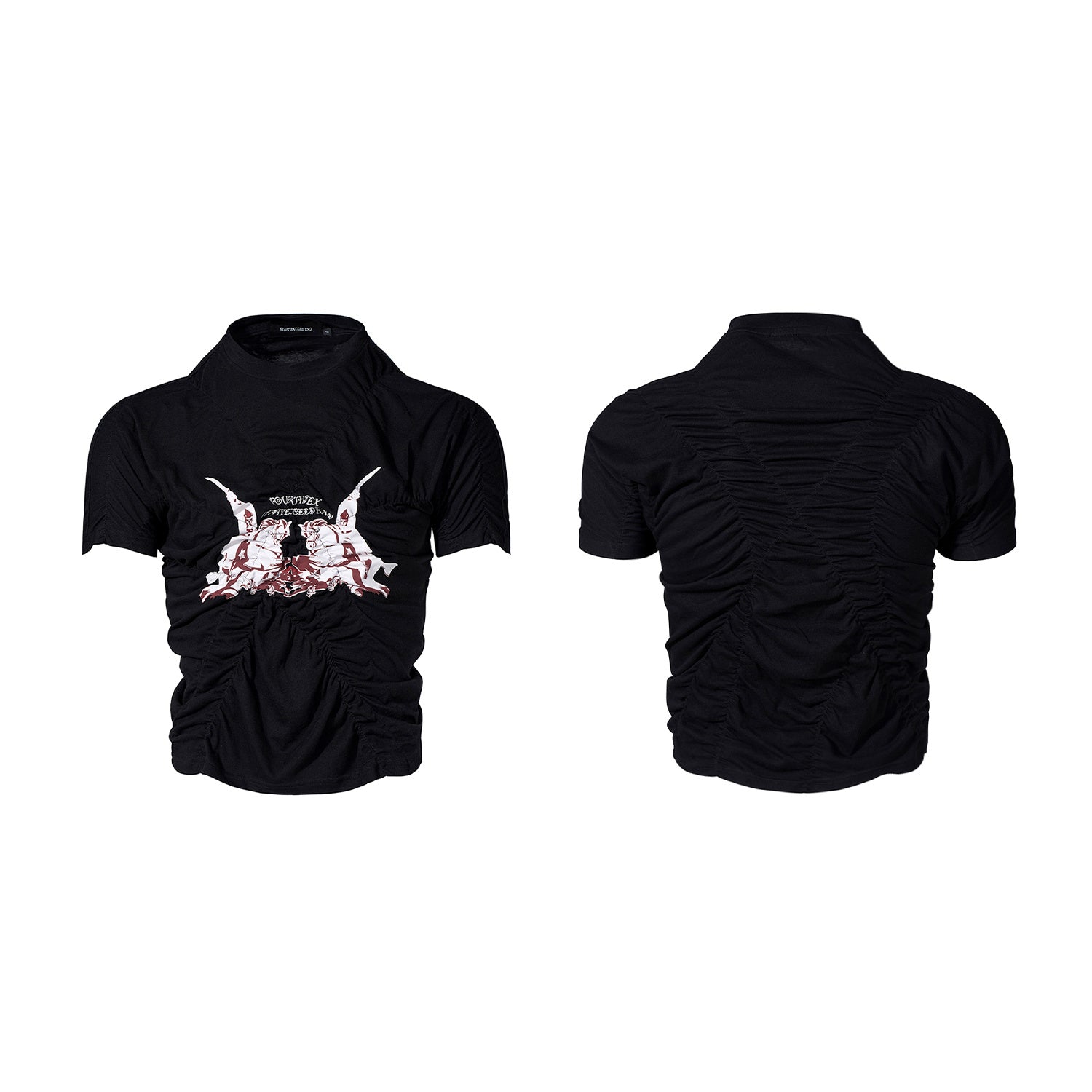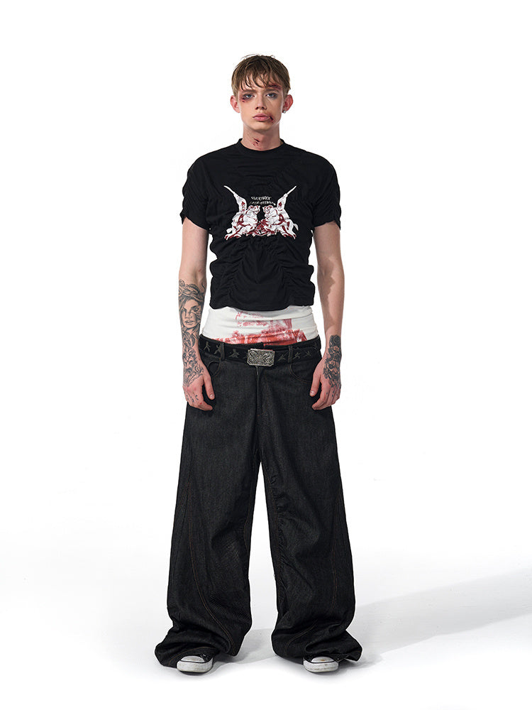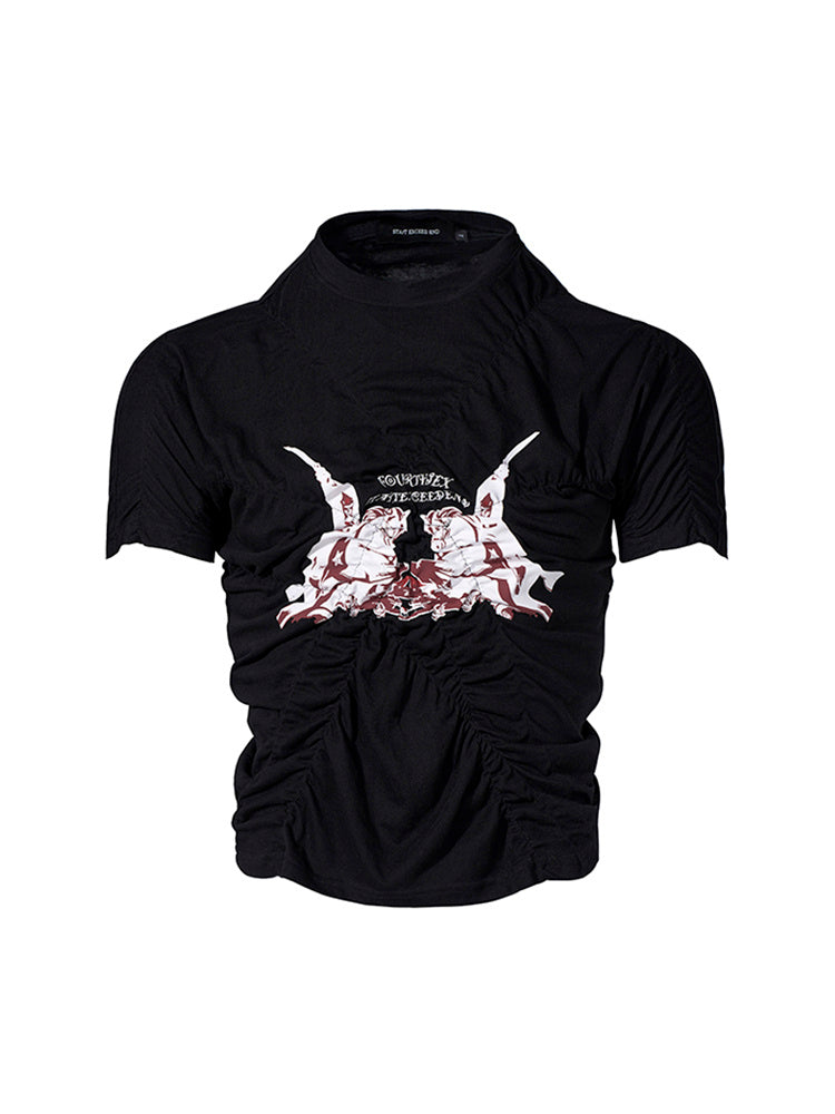 Pleating Men's Summer Printed Slim Fit Black Short Sleeve