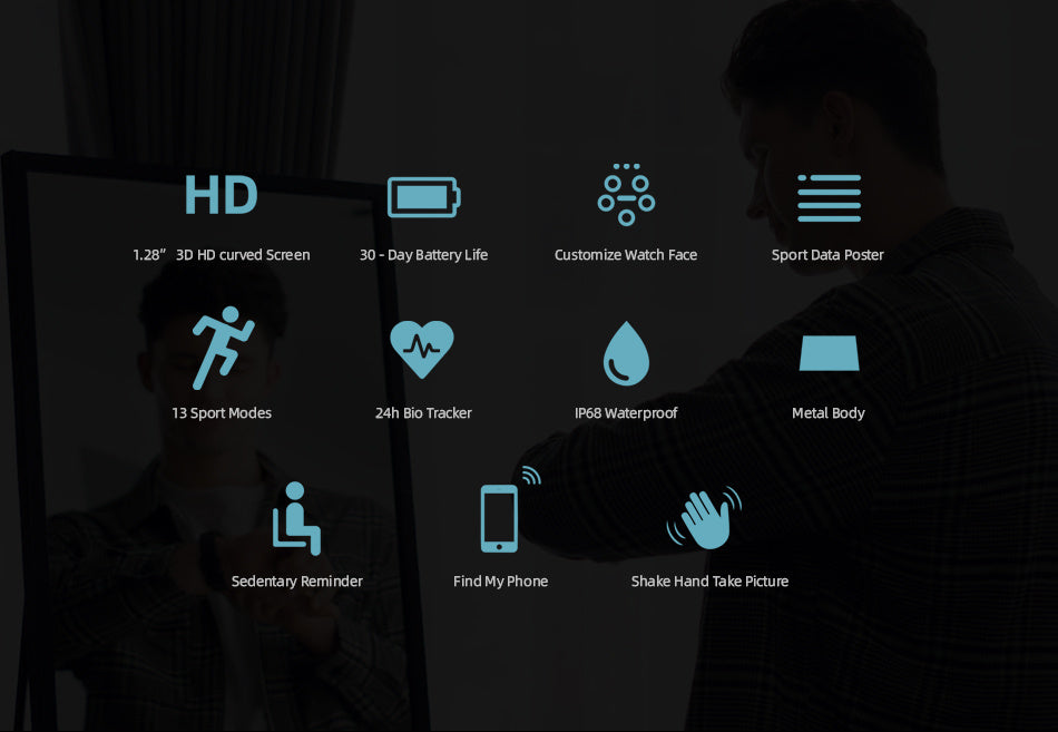 1.28” TFT large screen, 240*240 HD display provides you clear and vivid view. 3D curved glass with curvy alloy case ensures every touch smooth and mellow. With accurate algorithm to record mileage, and calories data. Equipped with built-in low consumption sensors, accurate workout status can be tracked in real time Built-in optical heart rate sensor with advanced algorithm ensures you full day heart rate monitor at rest or during workout. Comes with a large battery capacity and IP68 waterproof level. Support notification push and sleep monitor.